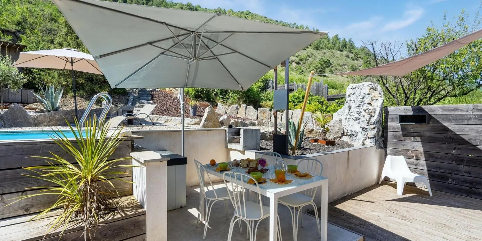 Featuring a garden, private pool and mountain views, chambre studio La louve is located in Banne. This property offers access to a terrace and free private parking.